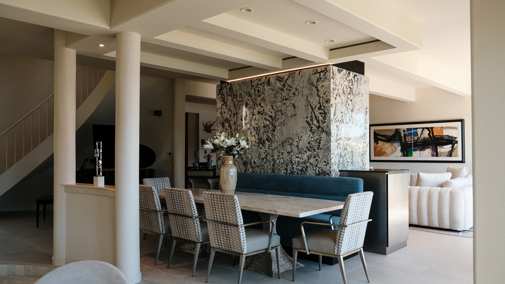 New master bathroom, new flooring throughout, custom solid quartzite fireplace installation, new mud and laundry room, powder room, and guest bedrooms/bathrooms.